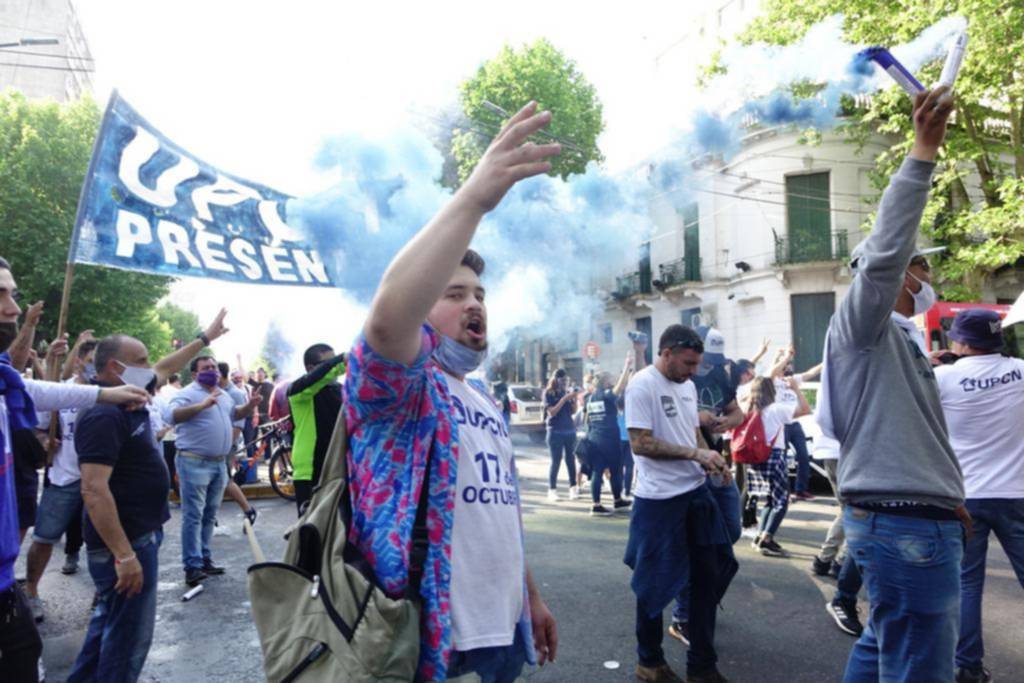 Frente a la sede de UPCN en 13 y 50 ahí si se percibió otra escena. Militantes cantando y mostrando otro colorido con bengalas de humo y banderas.