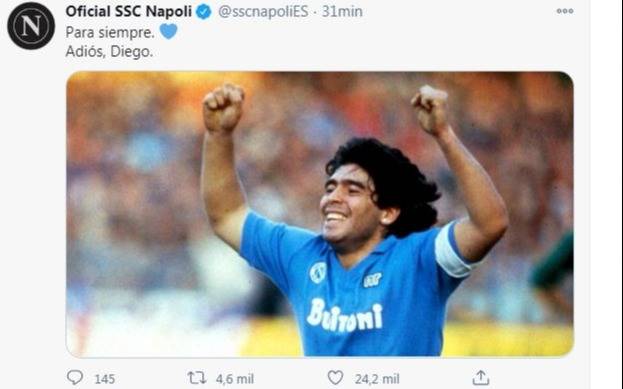 "El más fuerte de siempre. Adiós campeón", escribió en Facebook el canciller italiano Luigi Di Maio, originario de Nápoles.