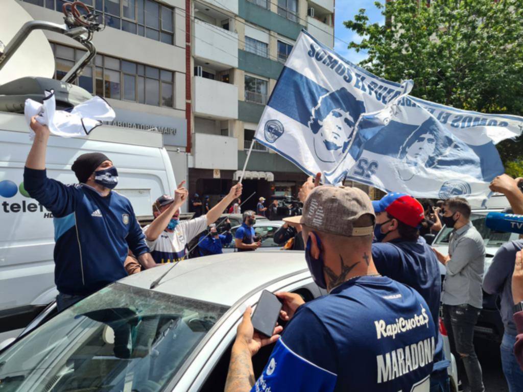 De repente el tránsito se corta y camisetas y banderas azules y blancas cambian la escena. Una caravana con unos 50 autos conforman un río azul y blanco que se detiene justo en la puerta de la Clínica. Todo es Diego y nada más que Diego. Los carteles, fotos y estampitas pegadas en el frente. “Solo te pido una gambeta más”, dice un cartel.