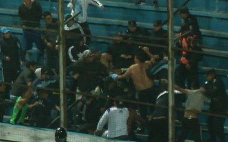 El juego debió interrumpirse definitivamente a sólo cinco minutos del comienzo cuando los inadaptados disfrazados de hinchas comenzaron a prender fuego la tribuna.