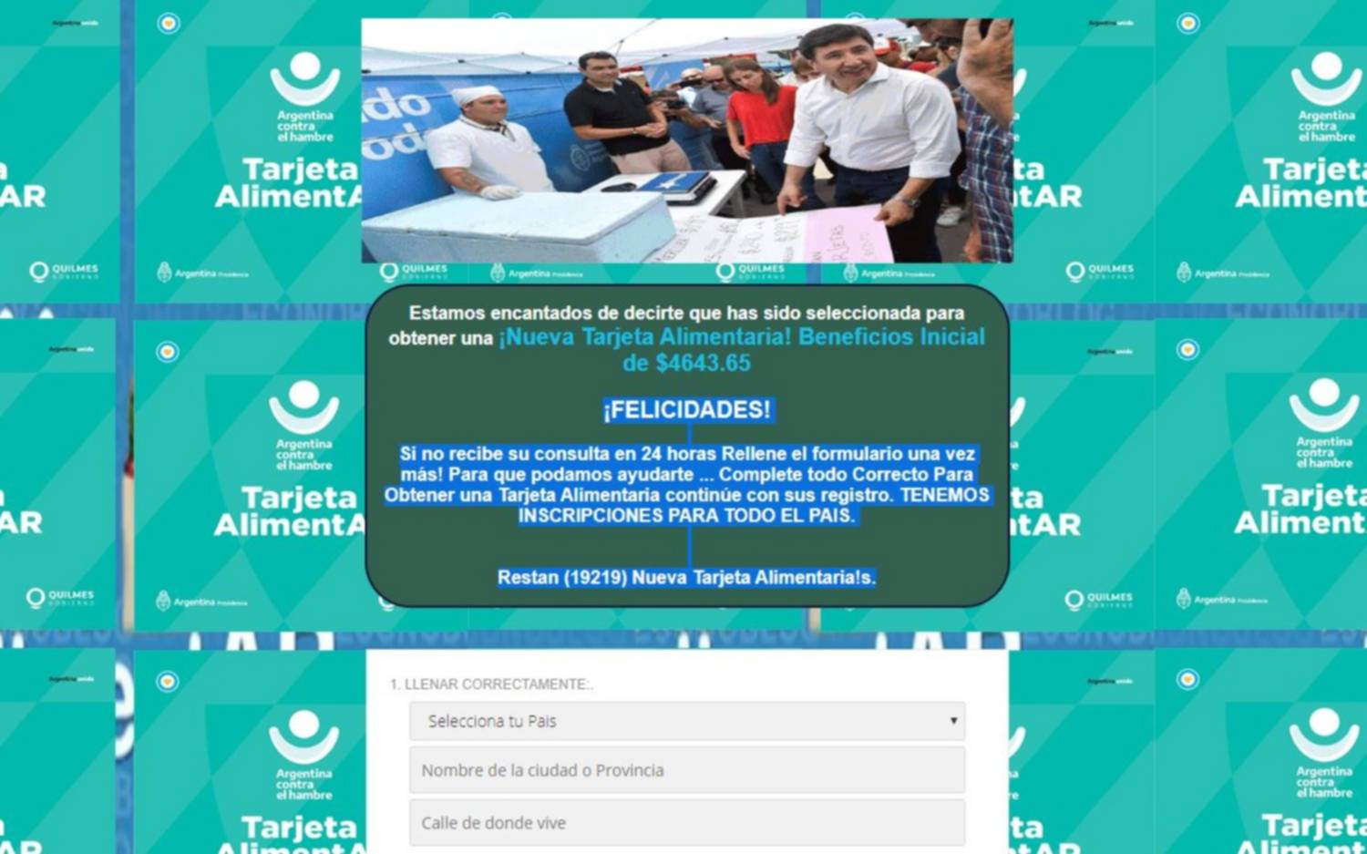 "Si no recibe su consulta en 24 horas Rellene el formulario una vez más! Para que podamos ayudarte ... Complete todo Correcto Para Obtener una Tarjeta Alimentaria continúe con sus registro. TENEMOS INSCRIPCIONES PARA TODO EL PAIS" señala el mensaje en una página en la que se pueden ver imágenes de fondo del logo de la Tarjeta Alimentar.