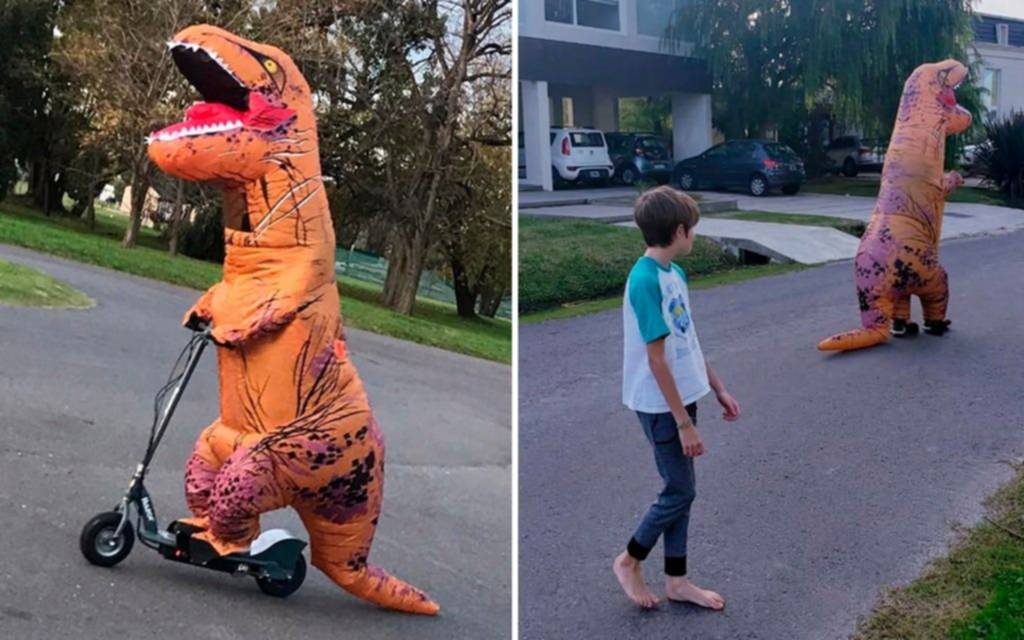 I.F. afirmó que mi idea era dar una vuelta y volver a casa, pero un vecino me sacó una foto y se viralizó. Y enseguida me empezaron a llamar por teléfono. Los chicos piden que pase el dinosaurio. Yo les dije que paso pero que no se pueden acercar, solo saludar desde dentro de sus casas”.