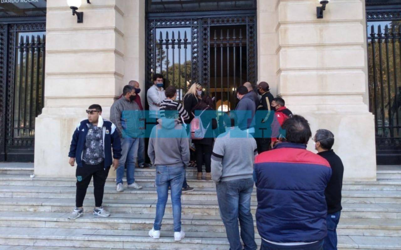 Un grupo de peones de taxis y remises de La Plata protestaban hoy en la puerta del Pasaje Dardo Rocha, en medio de un clima de tensión, en pedido de asistencia de alimentos a las autoridades municipales.