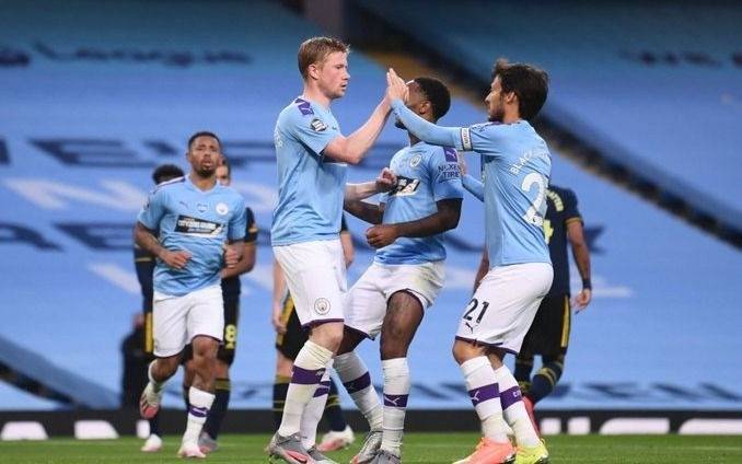 Los ingleses Raheem Sterling, Phil Foden y el belga Kevin De Bruyne, de penal, marcaron los goles en el estadio Etihad de Manchester a puertas cerradas.