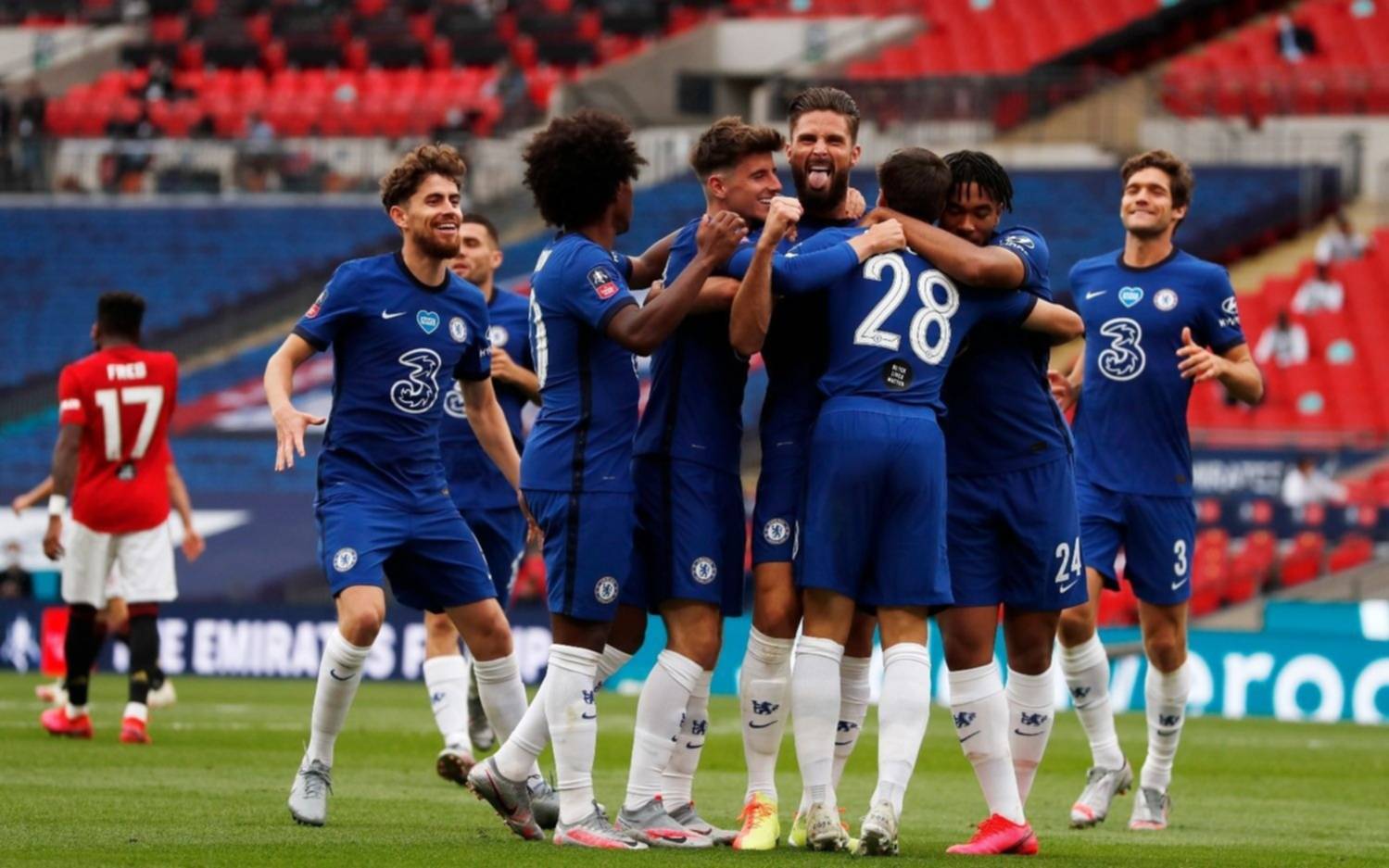 En la segunda semifinal de la FA Cup, Chelsea superó por 3 a 1 al Manchester United (Romero en el banco) y definirá el título frente al Arsenal el próximo 1º de agosto. Los goles de los “Blues”, que tuvieron en el arco a Wilfredo Caballero, llegaron por vía de Giroud (PT 45+11m), Mount (ST 1m) y Harry Maguire, en contra de su arco (ST 29m). Fernandes (ST 40m), de penal, descontó para los de Manchester.