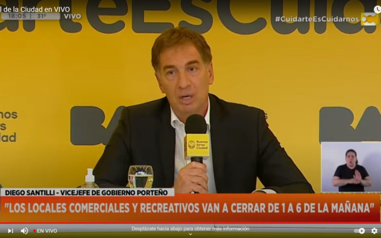 El vicejefe de gobierno de la Ciudad de Buenos Aires, Diego Santilli, se refirió a las medidas que se tomarán en su distrito a partir de esa noche. Habló en nombre de Horacio Rodriguez Larreta, aislado por ser positivo de coronavirus.