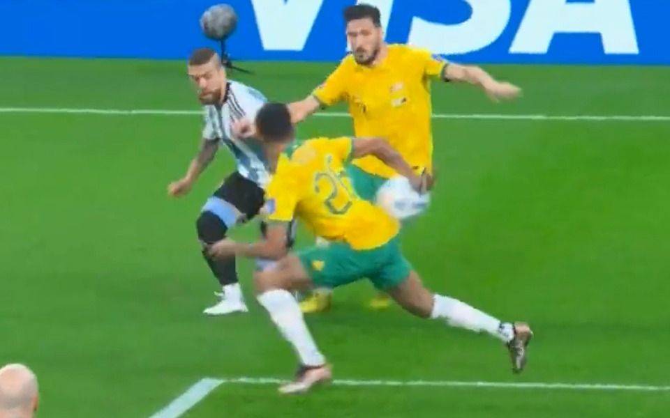 En una de las primeras jugadas del partido, Gómez intentó tirar un centro al área, pero fue frenado por Keanu Baccus. No obstante, todo el plantel argentino le reclamó al árbitro que la pelota rebotó en la mano del volante, pero Marciniak no hizo caso.