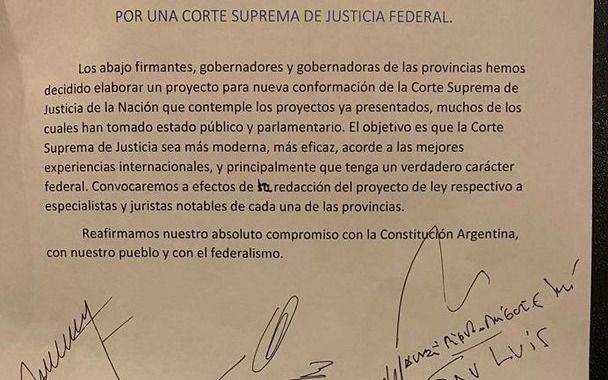 Un grupo de 16 gobernadores peronistas anunciaron la intención de presentar un proyecto de reforma de la Corte Suprema de Justicia para, según afirman, "sea más moderna, más eficaz" y "acorde a las mejores experiencias internacionales".