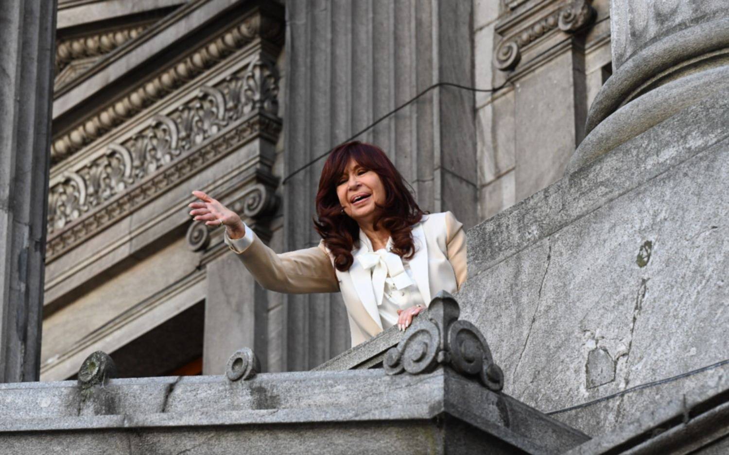 La ex presidenta permaneció durante algunos minutos saludando mientras desde abajo el grupo de militantes cantaban y expresaban su apoyo, en uno de los momentos más difíciles a partir del pedido de una condena de 12 años de prisión más la inhabilitación perpetua para ocupar cargos públicos.