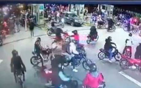En un momento, se observa como las motos van llegando a lugar en "manada", ante la mirada de los empleados de la estación ubicada en el cruce de la avenida San Martín y la calle Zapiola, que se encontraban atendiendo a dos clientes a bordo de camionetas y comenzaron a alertarse por la situación.