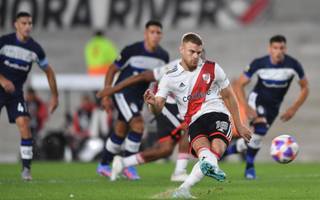 River, con campo, pelota y dominio del juego, no encontraba claridad en la definición. El exceso de vehemencia en la marca dentro del área de Guillermo Enrique le solucionó cualquier inconveniente al millonario. A los 26 minutos, Lucas Beltrán de penal puso el 1 a 0 para el puntero del torneo que llevaba al resultado el dominio del juego.