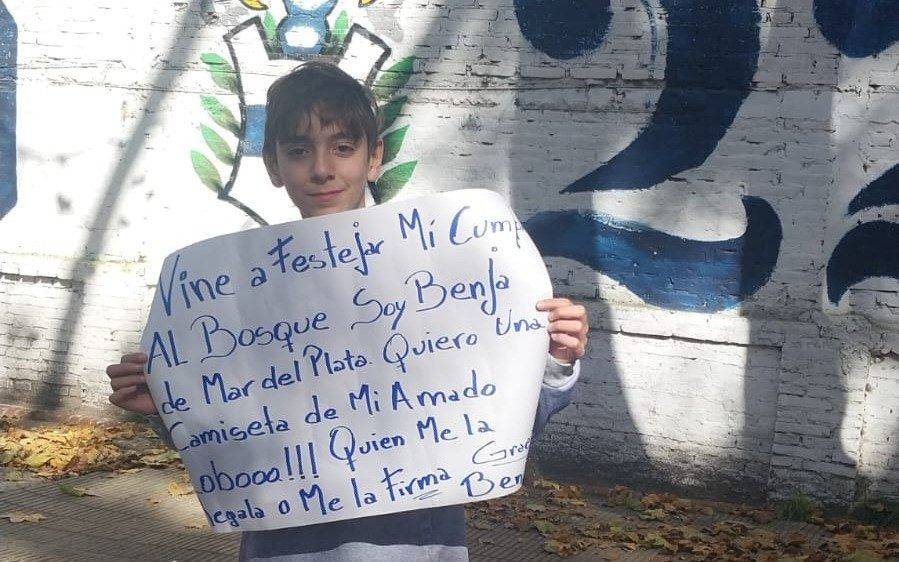 Para su viaje a La Plata Benjamín hizo un cartel en el que expresa: "Vine a pasar mi cumple al Bosque, soy Benja de Mar del Plata. Quiero una camiseta de mi amado Lobo!!! Quien me la regala o me la firma?". En ese sentido, la madre expresó: "Si se puede, él quiere sacarse una foto, entrar a la cancha con ellos o que le den una camiseta. Viene a ver al Lobo desde la panza, ama al Club y quiere jugar acá".