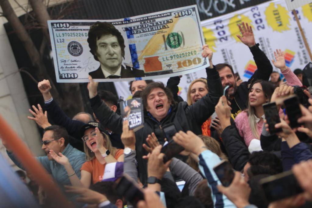 Durante la caravana, los militantes seguían al líder a pie, se acercaban para que les firme libros, dólares, banderas y buscaban tener “la selfie” con los candidatos que marchaban rumbo a la Gobernación. Entre los objetos que acercaron al fundador de La Libertad Avanza se encontraban un billete de dólar con la cara del libertario y una motosierra, que sirvieron para graficar dos de los planes del candidato en caso de acceder a la presidencia: la dolarización de la economía y el feroz recorte del gasto público.