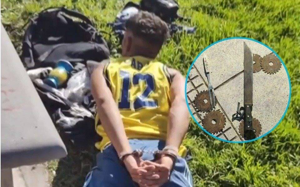 Al notar una situación irregular, los policías lo empujaron hacia el exterior y al revisarlo le encontraron un machete escondido entre sus ropas, además de varios discos de corte.