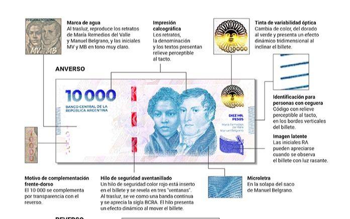 * La imagen latente (las letras “RA” pueden apreciarse cuando se observa el billete con luz rasante) y el motivo de complementación frente-dorso (al trasluz, se completa el motivo y aparece el valor “10.000”), son otras de las medidas de seguridad del nuevo billete.