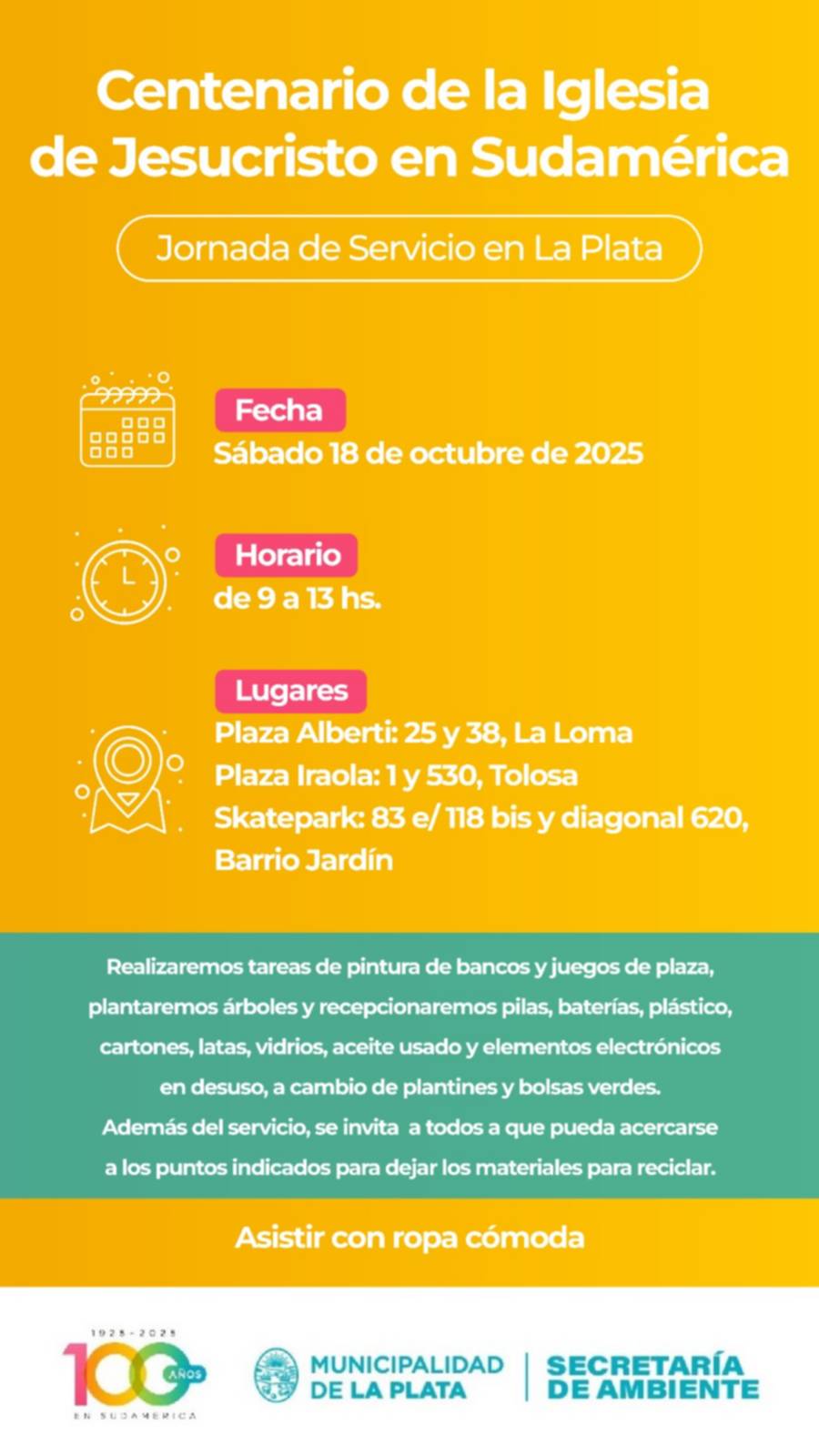 En el marco de la celebración de los 100 años de la Iglesia de Jesucristo de los Santos de los Últimos Días en Sudamérica, este sábado 18 de octubre, de 9 a 13 horas, se llevará a cabo una gran Jornada de Servicio en la ciudad de La Plata, en coordinación con la Municipalidad local, y se pide la colaboración de los vecinos para acercarse a tres plazas de la capital provincial para llevar elementos para reciclar a cambio de plantines y bolsas verdes.
