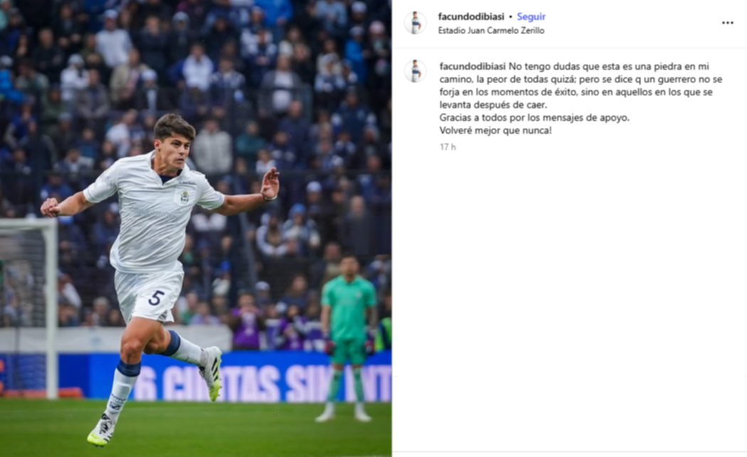El futbolista, que atravesará un tiempo prolongado de recuperación, usó su cuenta de Instagram para expresar sus sensaciones y enviar un mensaje cargado de optimismo. En su publicación, Di Biasi escribió: “No tengo dudas que ésta es una piedra en mi camino, la peor de todas quizá, pero se dice que un guerrero no se forja en los momentos de éxitos sino en aquellos en los que se levanta después de caer. Gracias a todos por los mensajes de apoyo. Volveré mejor que nunca”.