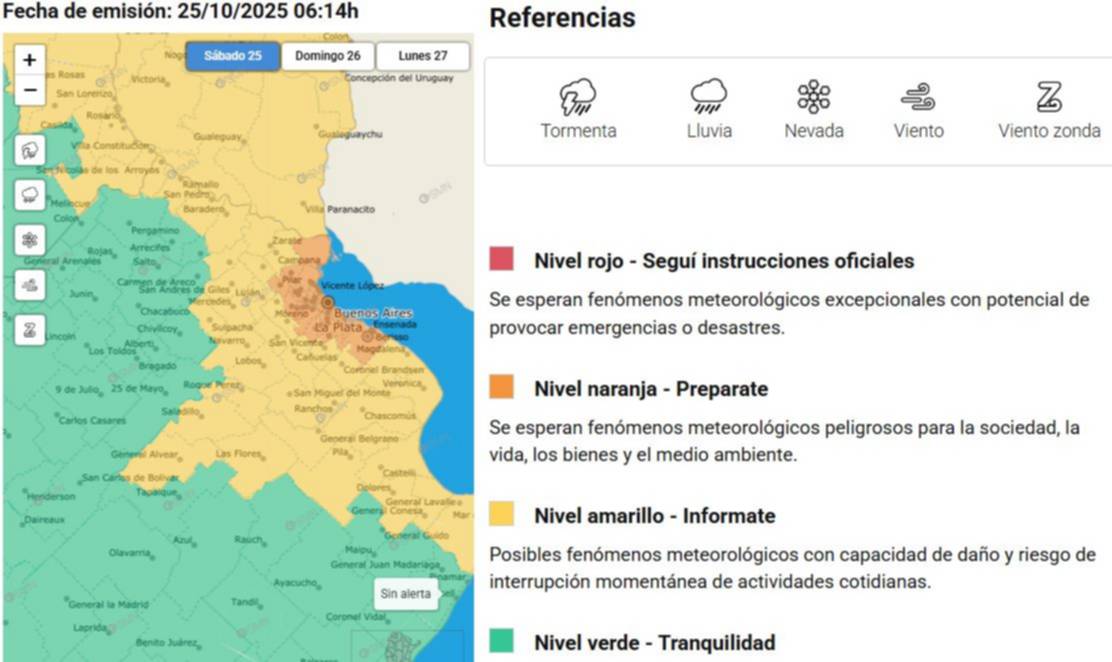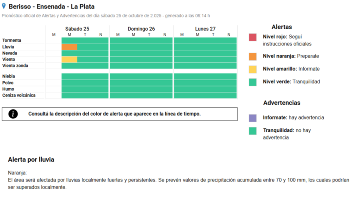 A las 4h de este sábado, el SMN actualizó el alerta naranja por lluvias intensas en la región del Gran La Plata y en toda el AMBA, esto es: La Plata - Berisso - Ensenada- Almirante Brown - Avellaneda - Berazategui - Campana - Cañuelas - Ensenada - Escobar - Esteban Echeverria - Exaltación de la Cruz - Ezeiza - Florencio Varela - Gral. Belgrano - Gral. Las Heras - Gral. Paz - Gral. Rodríguez - Gral. San Martin - Hurlingham - Ituzaingó - José C. Paz - La Matanza - Lanús - Lobos - Lomas de Zamora - Lujan - Magdalena - Malvinas Argentina - Marcos Paz - Mercedes - Merlo - Moreno - Morón - Navarro - Pilar - Pte. Perón - Quilmes - S. A. de Giles - San Miguel - San Vicente - Tigre - Tres de Febrero - Vicente López.