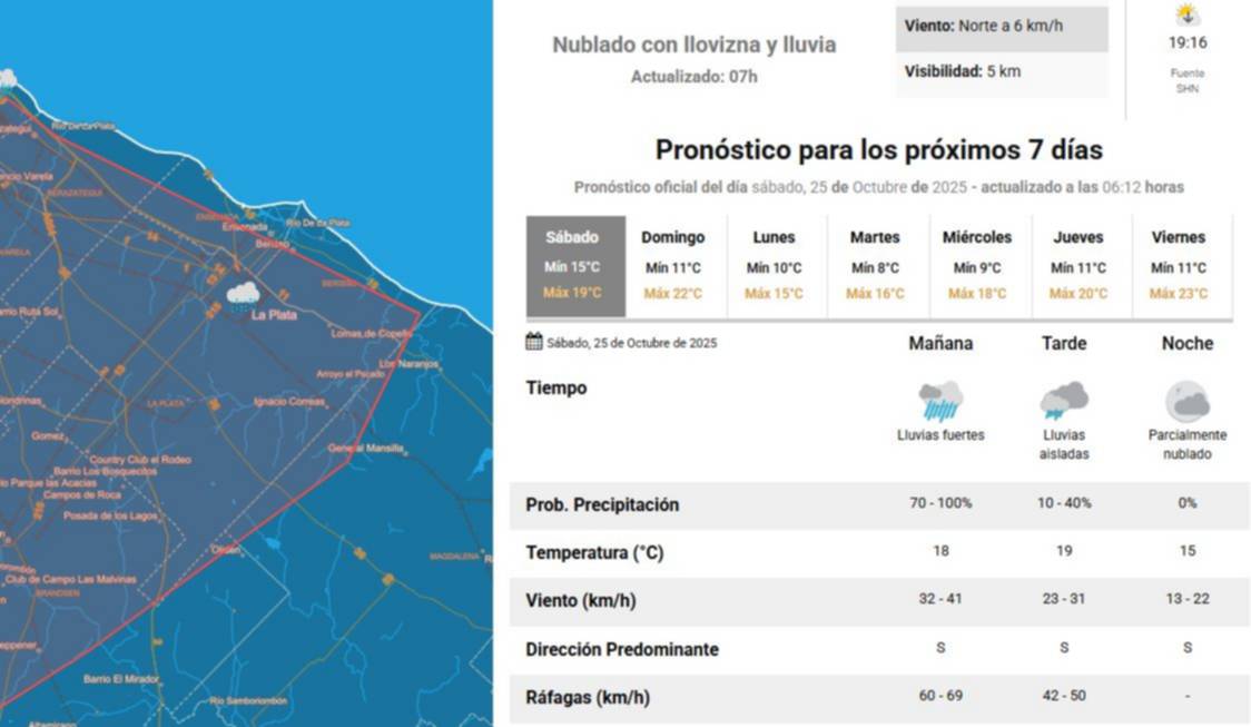 El tiempo se presentaba este sábado en La Plata y alrededores con lluvias fuertes durante la mañana y lluvias aisladas a partir del mediodía, en tanto que a la noche se aguarda cielo parcialmente nublado. Las temperaturas se ubicarán entre 15 y 19 grados, informó el Servicio Meteorológico Nacional (SMN).