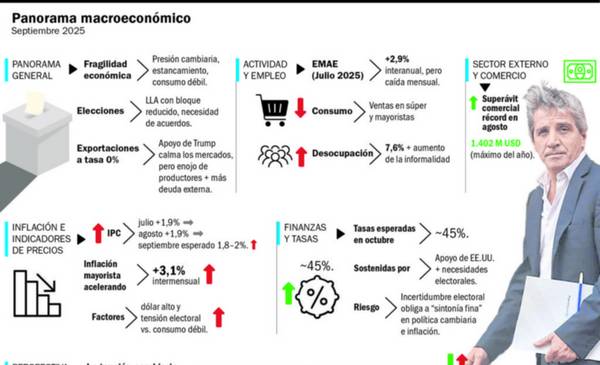 La economía argentina transitó septiembre en un escenario de fragilidad, con señales mixtas que combinan cierta estabilidad en los precios minoristas y un frente externo que resiste, pero con actividad estancada, consumo retraído y tensiones cambiarias cada vez más visibles. Así lo advierte el Panorama Macroeconómico de septiembre elaborado por la consultora Qualy, al que accedió este medio.