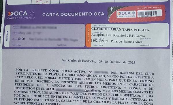 Un socio de Estudiantes formalizó un reclamo legal mediante una carta documento dirigida al presidente de la AFA, exigiendo que se den a conocer los audios del sistema VAR correspondientes al reciente partido entre Estudiantes y Barracas Central.