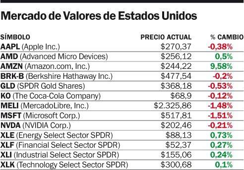 La jornada estuvo marcada por la fuerte suba de Amazon, cuyas acciones treparon más de 11% en la Bolsa de Nueva York luego de la publicación de sus resultados trimestrales. El papel alcanzó un nuevo máximo histórico de 249,12 dólares, elevando su capitalización bursátil en unos 200.000 millones de dólares.