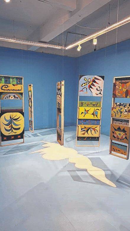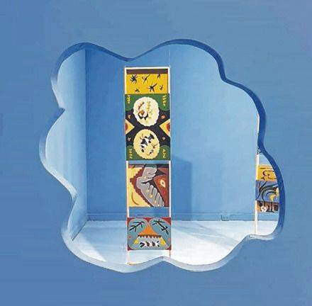 Un concepto que la galería incorporó en su estructura, habiendo construido una pared solo para abrir una ventana con forma de nube “cósmica” , y a través de la que se puede espiar la segunda sala en la que sigue vibrando la misma paleta de color cielo. Aquí, a la par de fotografías que documentan las primeras muestras de Iacopetti en comercios de barrio, penden del techo los “Postes pictográficos” (1969-1972), óleos sobre chapadur de grandes dimensiones.