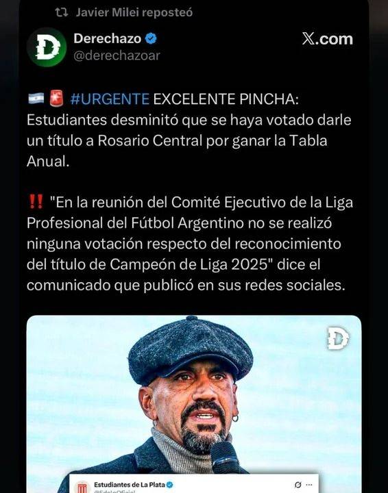 En el medio de la polémica desatada por la consagración de Rosario Central, el presidente de la República Argentina, Javier Gerardo Milei, volvió a meterse en la discusión pública y decidió repostear un mensaje en X que respaldó al sector opositor, encabezado por Estudiantes de La Plata y su presidente, Juan Sebastián Verón.