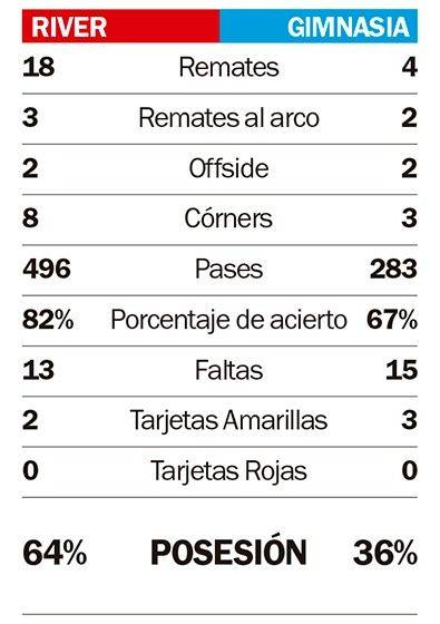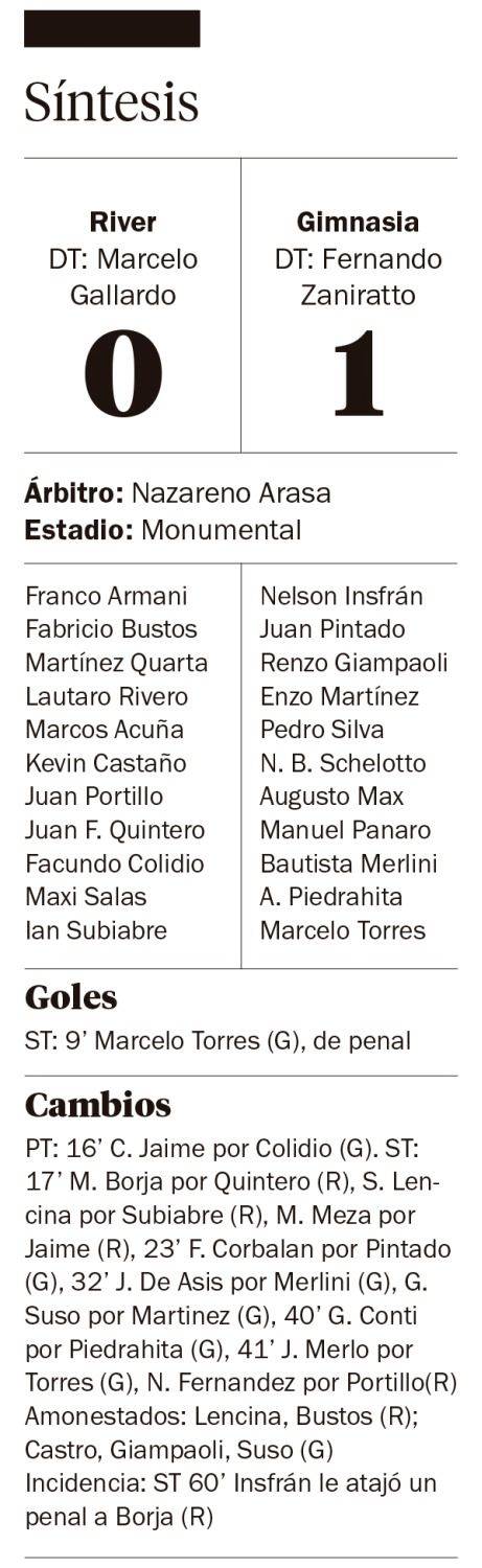Los minutos finales fueron de extrema tensión. El ingresado Nacho Fernández tuvo un remate muy desviado mientras los hinchas millonarios gritaban “que se vayan todos”. Arasa dio 9 minutos de adición y el equipo tripero aguantó hasta que el arbitro vio un penal de Suso a Martínez Quarta por una sujeción. En ese momento, Gimnasia sintió que se le escapaba un partido redondo. Pero otra vez apareció Insfrán, que fue Monomental y sacó el remate del colombiano Borja contra el poste izquierdo. Igualito que en Junín. Insfrán fue enorme, la cereza de postre de un esfuerzo colectivo enorme cuyo premio es casi abrochar la continuidad en Primera División