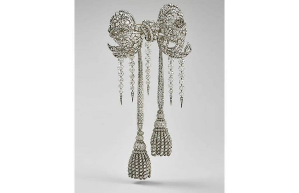 • Un broche-lazo con 2634 diamantes. Fue creado en 1855 como parte central de un cinturón. Cuando el imperio cayó, el broche-lazo fue adquirido por Caroline Astor, una de las grandes damas de la sociedad neoyorquina. Mientras las monarquías estaban en decadencia, las “reinas burguesas” comenzaban a brillar en el firmamento. En 1902 la joya volvió a cruzar el charco ya que lo compraron los Beauchamp, una familia aristócratica de Londres cuyas mujeres lo lucieron hasta la década del 80 en que fue vendido a una joyería que, a su vez, se lo vendió al Louvre en 2008.