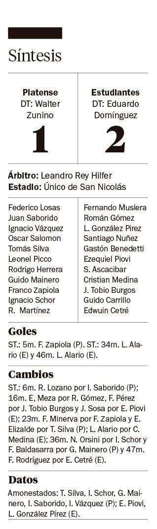 Estudiantes lució en todo el partido un cansancio mental y también físico. Lógico para un equipo que había jugado un último mes de la manera que jugó. Pero a este equipo hay que matarlo para que efectivamente se muera. Domínguez metió cambios y el equipo mejoró, al punto que en los últimos 15 minutos jugó con una grandeza total. Con José Sosa, Fabricio Pérez, con Cetré imparable, con Ascaibar que mejoró y un Lucas Alario que se guardó todo su arsenal para este final. En 10 minutos hizo todo lo que no pudo en el año. Primero empató de cabeza tras una habilitación de Pérez y en el primer minuto de descuento anotó el segundo gol, tras un tiro de esquina apareció como aquel goleador que fue a buscar el Pincha y estampó el 2-1, merecido porque tuvo coraje y no se dio por vencido otra vez. Y merecido porque e el partido no había sido superado por su rival, salvo el agotamiento lógico del trajín .