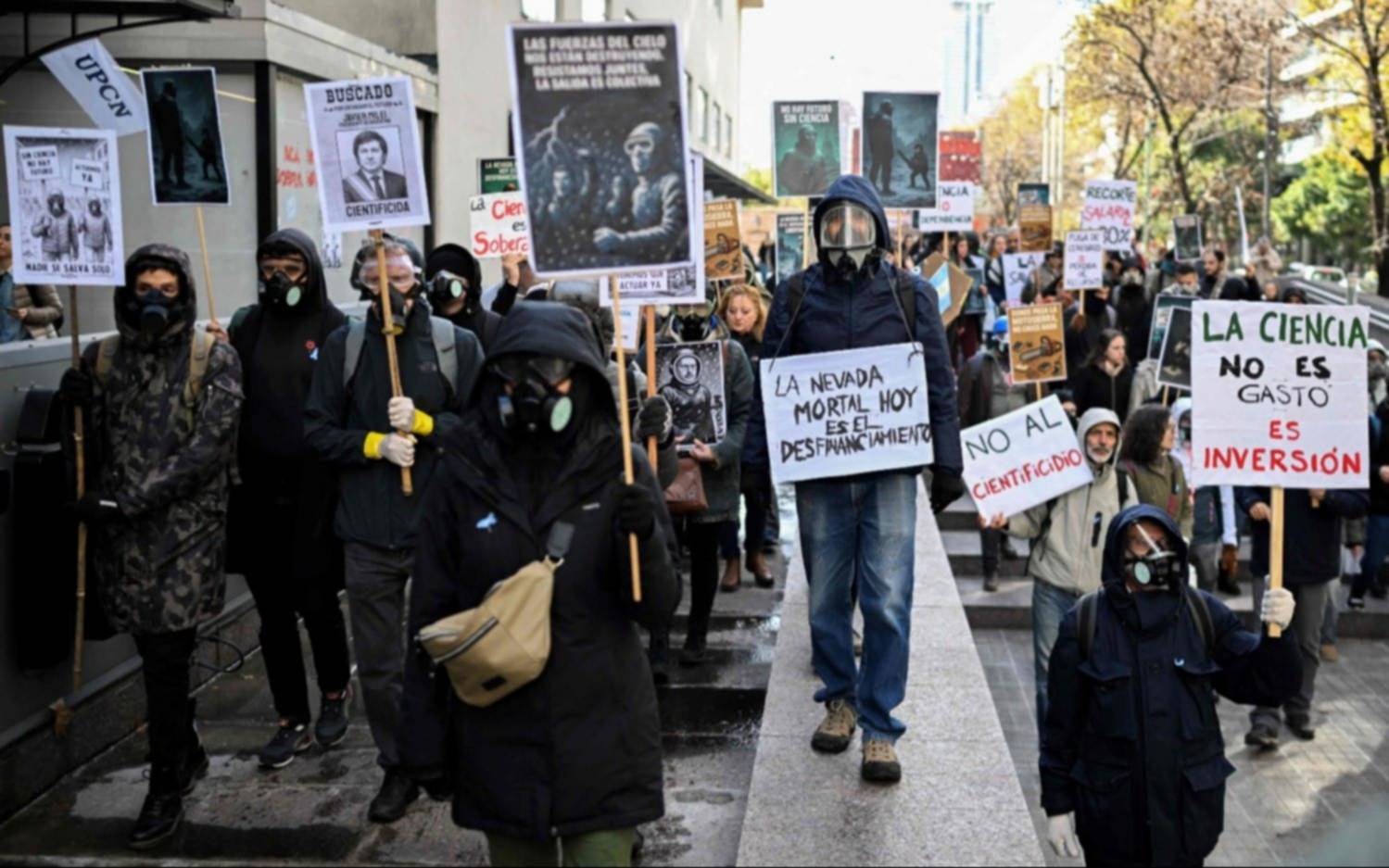 Inspirados en “El Eternauta”, el drama distópico de producción argentina que se ha convertido en un éxito de audiencias en Netflix, decenas de científicos se movilizaron en Buenos Aires con máscaras de gas, pero no para protegerse de la nevada tóxica que reproduce la ficción sino de las políticas de ajuste del presidente ultraderechista Javier Milei. “La tormenta avanza, la resistencia también”, rezaba la convocatoria para visibilizar la crítica situación de la ciencia y la tecnología argentina por la falta de financiamiento y un congelamiento de salarios y becas.