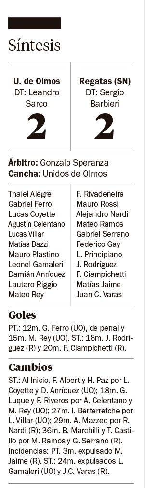 El partido comenzó siendo friccionado y con incidencias tempranas, ya que Regatas sufrió la expulsión (roja directa) de Jaime por insultar, cuando apenas se habían jugado 3 minutos. Y a los 25, hubo otras dos expulsiones: Gamaleri, en el local, y Varas en Regatas. En la parte complementaria, el partido se hizo de ida y vuelta. Olmos sacó dos goles de ventaja gracias al penal de Ferro (12) y Rey (15). Pero Regatas reaccionó y llegó al empate a través de Rodríguez y Ciampichetti.