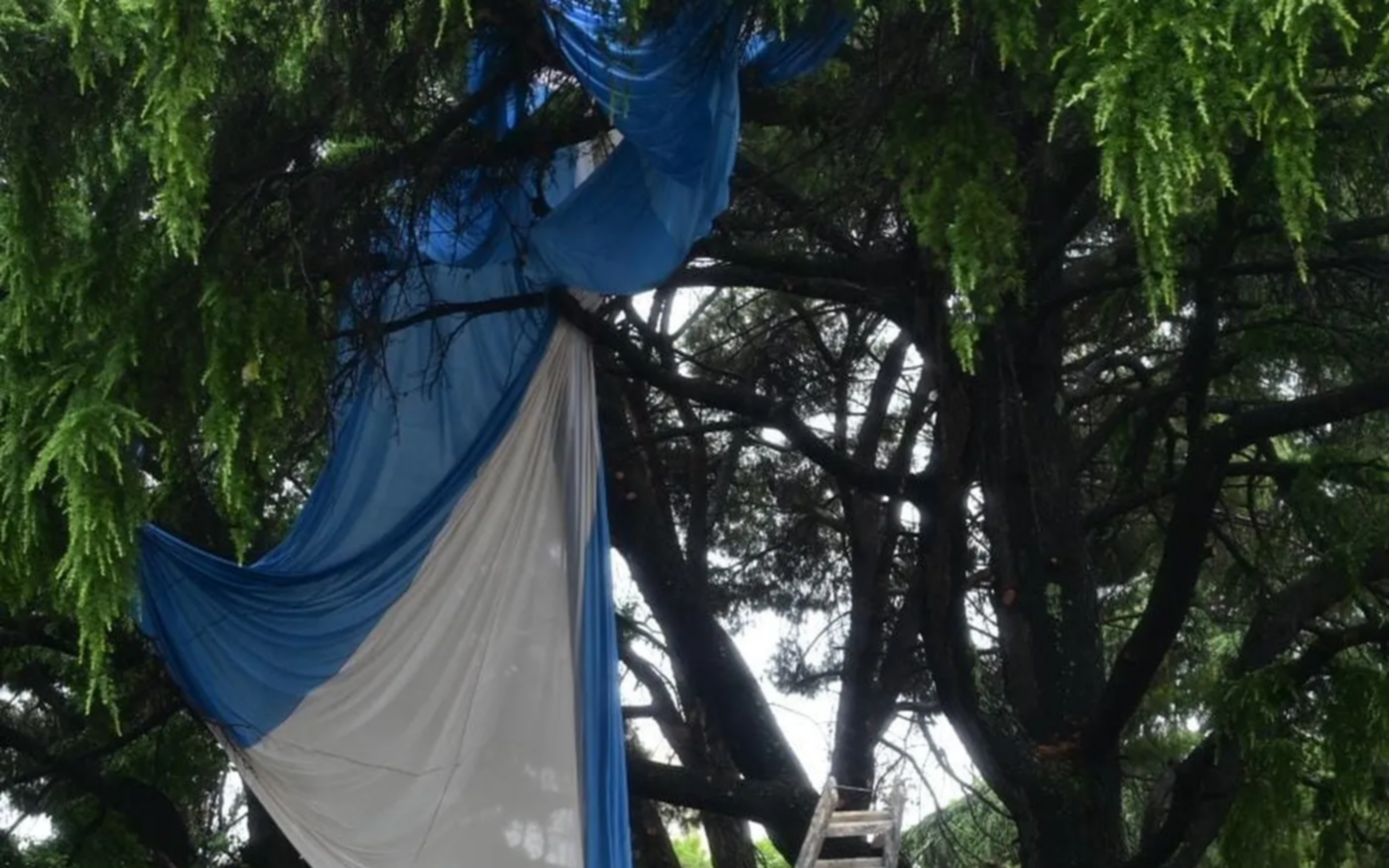 Es que por los fuertes vientos y la intensa tormenta que duró algunos minutos, la bandera nacional voló hasta engancharse en un árbol y quedó destrozada. Personal municipal tuvo que recurrir a una grúa para rescatarla.