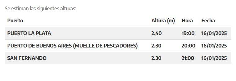 Asimismo, el Puerto de Buenos Aires se encontrará en 2,30 metros. Mientras que en San Fernando se registrarán valores de 2,30 metros.
