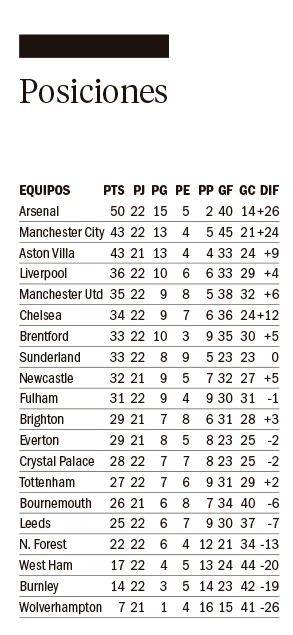 El equipo de Mikel Arteta sigue como líder y estiró la diferencia a siete puntos con los de Pep Guardiola, aunque Aston Villa podría recortar si vence hoy a Everton.