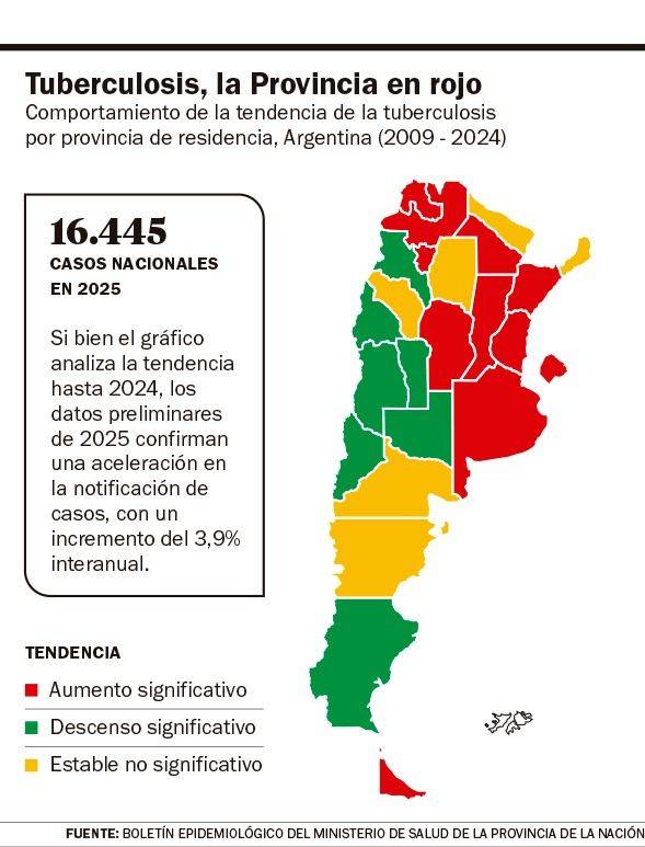 El último Boletín Epidemiológico de la provincia de Buenos Aires advirtió, en el marco de “Eventos de Notificación Obligatorio”, que en 2025, se registraron 5.915 casos de tuberculosis. No obstante, está expresada como “una enfermedad endémica bajo programa de control”.