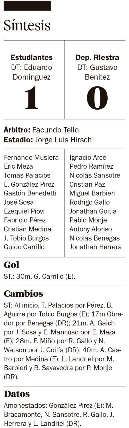 Y volvió a ganar Estudiantes en el Apertura. Le costó y mucho. Pero triunfó de manera merecida por el tanto de Guido Carrillo de cabeza, luego de un desborde por la izquierda de Brian Aguirre. El jugador que llegó para reemplazar a Cetré se mimetizó con el colombiano para abrir la puerta que se estaba cerrando demasiado. Así alcanzó el 1-0 sobre Deportivo Riestra para seguir de cerca a Vélez y tomar impulso para jugar el clásico la próxima semana ante Gimnasia. Fue justo y hasta pudo ser más amplio el resultado; también es cierto que el arquero lo salvó de un empate que hubiese sido demasiado castigo en el final.