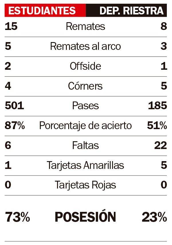 Estudiantes, con un esquema 4-2-3-1 muy versátil fue más que Riestra pero se nubló en los metros finales. La mejor noticia que se llevó en ese primer período fue el nivel de Tomás Palacios: rápido de piernas, buen porte y sin fallas en el contacto. Con rodaje no tendrá problemas para ganarse el puesto en una defensa que defendió mano a mano todo el tiempo. Además de la marca mostró criterio y decisión de pasar al ataque, algo que no se ve demasiado seguido en el fútbol argentino. Tuvo todas buenas apariciones menos una, un blooper que casi termina en gol en contra. Le falló su confianza.