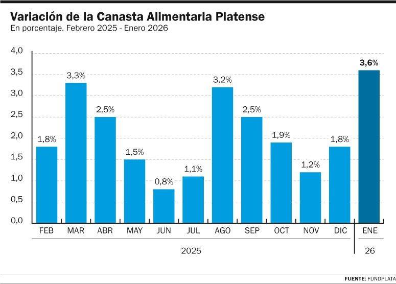 La medición interanual volvió a reflejar la presión acumulada sobre los alimentos. Entre enero de 2025 y enero de 2026, la canasta alimentaria platense mostró un incremento del 28,3%, con especial incidencia de los productos frescos y una dinámica que continúa condicionando el gasto cotidiano de los hogares.