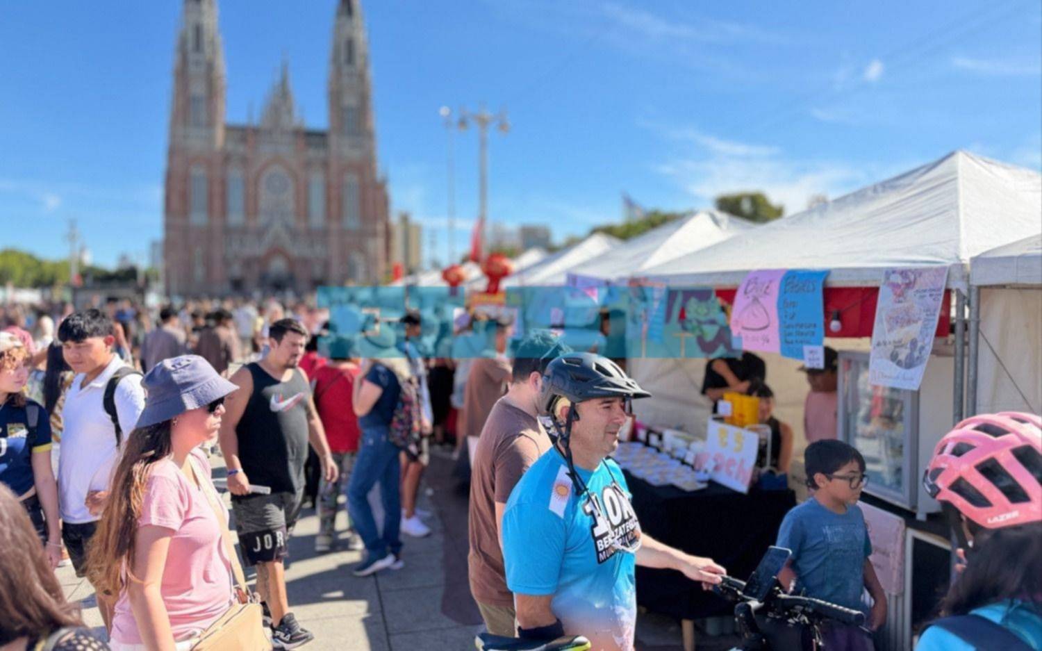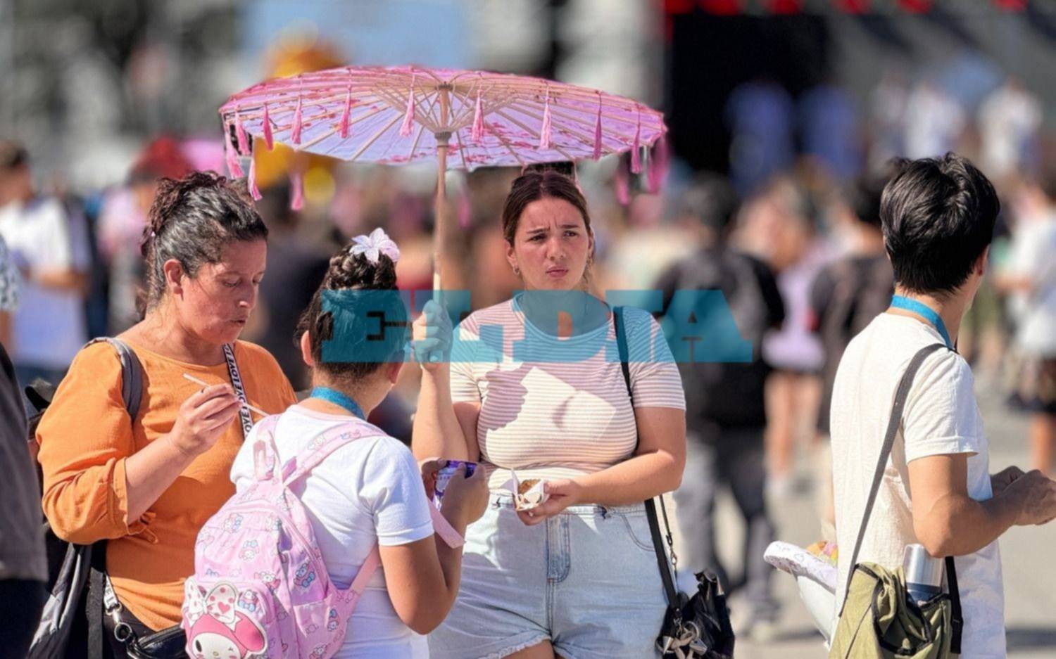 La plaza está colmada y el movimiento es constante en cada uno de los sectores. Bajo un sol intenso, se multiplican los paraguas orientales que muchos asistentes utilizan para resguardarse, aportando además una postal característica de la celebración.