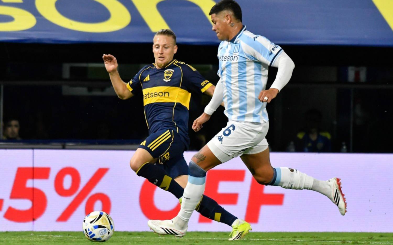 Hubo más pelotazos largos que llegadas a los arcos. Esa es la mejor definición de una etapa marcada por la escasa fluidez de ambos equipos y la carencia de ideas en el último tercio de la cancha. Racing mostró rebeldía de la mano de Matko Miljevic, quien sacudió un disparo frontal en el único avance de riesgo y provocó las dos amarillas de su rival (Ayrton Costa y Tomás Belmonte), mientras que Boca Juniors se diluyó en permanentes envíos largos a la dupla Cavani-Merentiel.