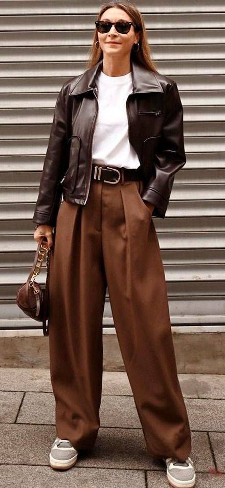 Las camperas de cuero son las grandes protagonistas del entretiempo. En tonos chocolate, suela o marrón oscuro, transforman un conjunto básico en una propuesta con presencia. Llevadas sobre camisas oversize —ya sean de jean lavado o a cuadros— y pantalones wide-leg, equilibran el volumen y aportan carácter.