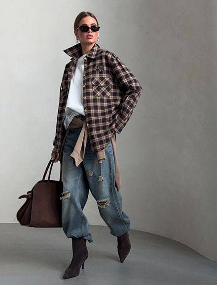 Las camisas amplias, en jean o estampadas, son la pieza ideal para acompañar chalecos y camperas. Su amplitud permite comodidad sin perder estilo y aporta un aire casual que contrasta con pantalones más estructurados.