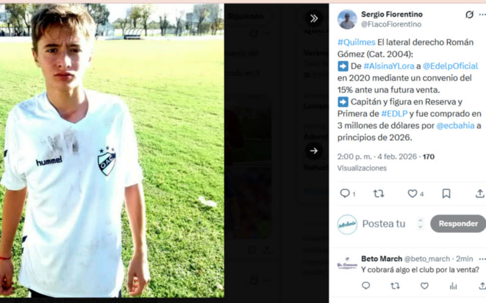 El Quilmes Atlético Club pedirá un porcentaje por la venta del ex futbolista de Estudiantes, Román Gómez al Bahía de Brasil que se llevó adelante hace algunos días. Luego de un destacado desempeño durante el 2025, el elenco brasileño decidió apostar por el defensor y le compró el pase al Pincha por una suma de 3 millones de dólares, donde el club platense se reservó un 10% de una futura venta y el jugador selló un contrato por cinco años.