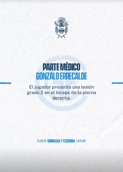Errecalde, titular en los últimos tres partidos en Gimnasia, dejó su lugar a Renzo Giampaoli, justamente el central que perdió el puesto por el lesionado. Al ser sometido a diversos estudios médicos, se supo que presenta una lesión "grado 2 en el bíceps de la pierna derecha".