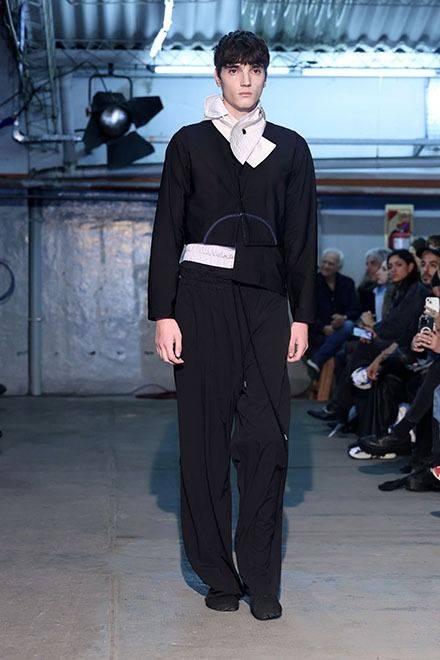 Los elásticos super anchos y los frunces extremos en cuellos y cinturas reforzaron esa tensión entre estructura y libertad. Cada ajuste parecía contener energía, como si la prenda estuviera preparada para expandirse en cualquier momento. Esa dinámica hizo que el cuerpo no fuera solo soporte, sino protagonista activo del diseño.