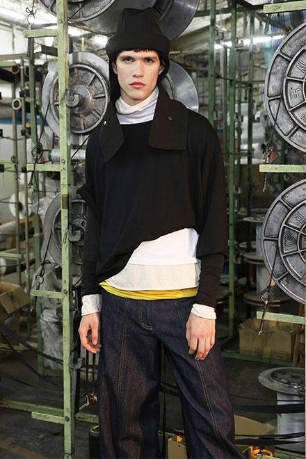 Uno de los puntos más interesantes de la propuesta fue el trabajo sobre la silueta. JT exploró conjuntos de dos piezas en mimesis absoluta, donde las partes parecían replicarse y dialogar entre sí. Esa lógica se trasladó tanto a gabardinas de corte clásico como a piezas en denim, generando un diálogo entre tradición y experimentación. Los textiles, por su parte, evolucionaron hacia materiales técnicos e impermeables, pensados para acompañar el movimiento y responder a la exigencia física que propone la idea de combate.