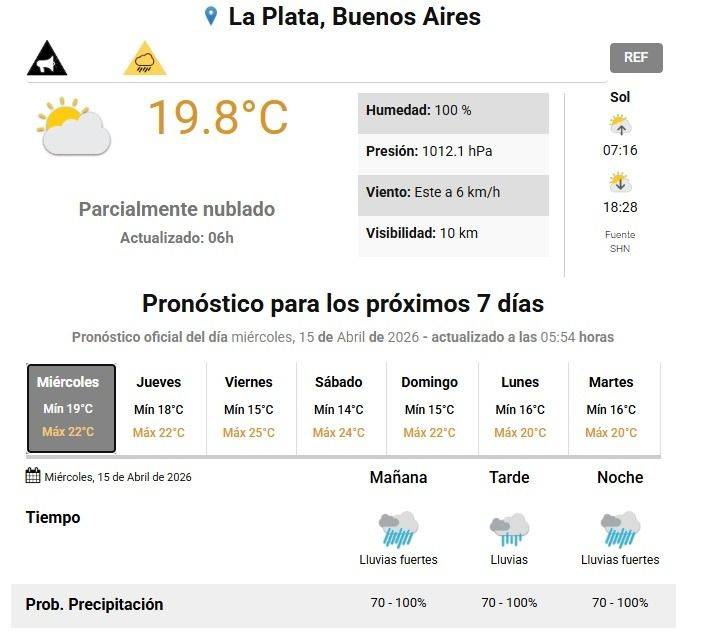 Miércoles pasado por agua es el pronóstico del tiempo del Servicio Meteorológico Nacional (SMN) para La Plata, que está bajo alerta amarillo por fuertes lluvias. A la madrugada comenzó una leve llovizna y ya a las 6 se largó con todo. Se trató de una fuerte lluvia de corta duración, pero que llegó a anegar algunas calles platenses, según el reporte de los vecinos.